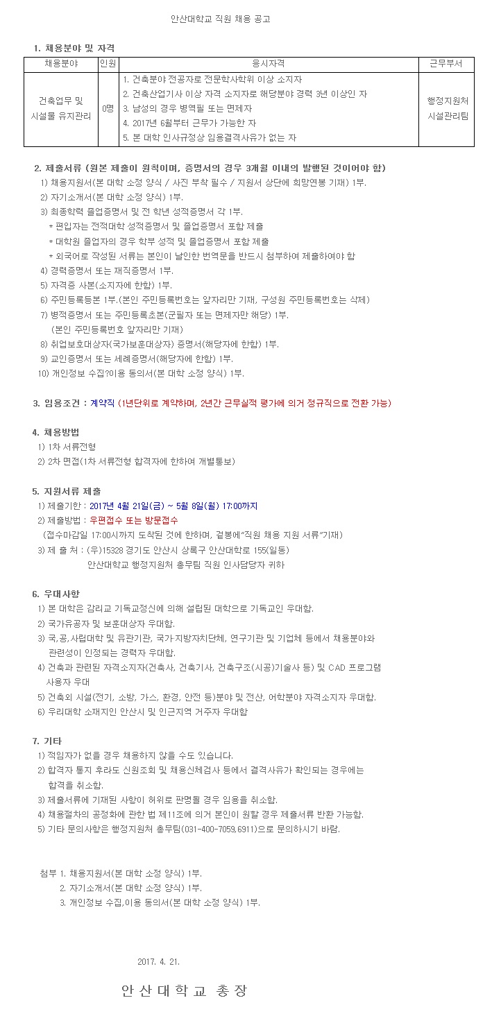 [¾È»ê´ëÇб³] Á÷¿øÃ¤¿ë(°ÇÃà¾÷¹« ¹× ½Ã¼³¹°À¯Áö°ü¸®) °ø°í ( ~5.8)