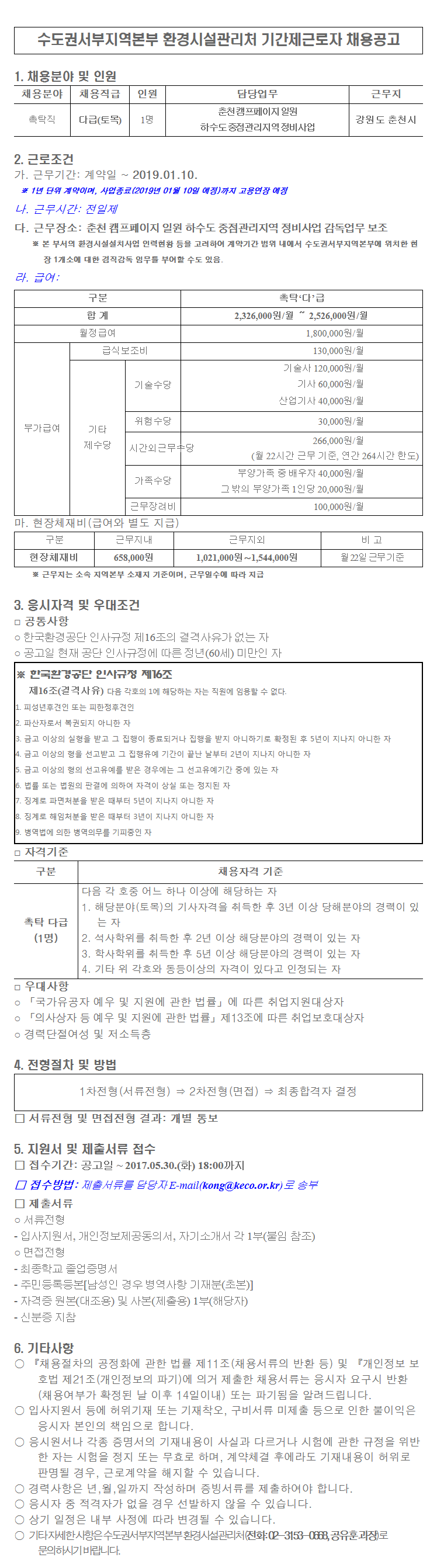 | Á¦¸ñ | [Çѱ¹È¯°æ°ø´Ü]¼öµµ±Ç¼ºÎÁö¿ªº»ºÎ ȯ°æ½Ã¼³°ü¸®Ã³ ±â°£Á¦±Ù·ÎÀÚ Ã¤¿ë°ø°í(~5.30) | ||