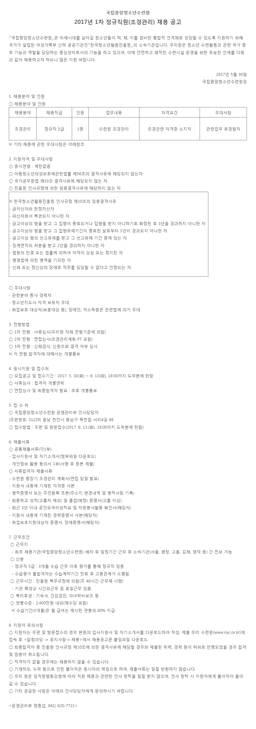 | Á¦¸ñ | [±¹¸³Áß¾Óû¼Ò³â¼ö·Ã¿ø]2017³â 1Â÷ Á¤±ÔÁ÷¿ø(Á¶°æ°ü¸®) ä¿ë °ø°í(~6.13) | ||
