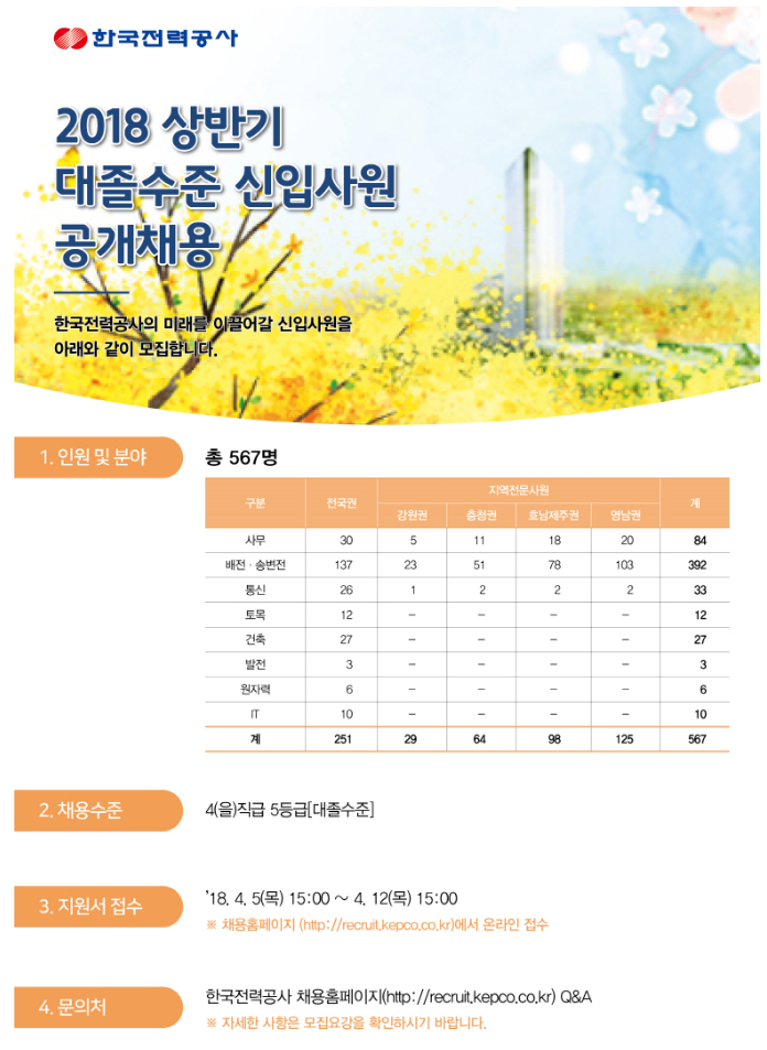 [Çѱ¹Àü·Â°ø»ç]2018³âµµ »ó¹Ý±â ´ëÁ¹¼öÁØ ½ÅÀÔ»ç¿ø °ø°³Ã¤¿ë(~4.12)