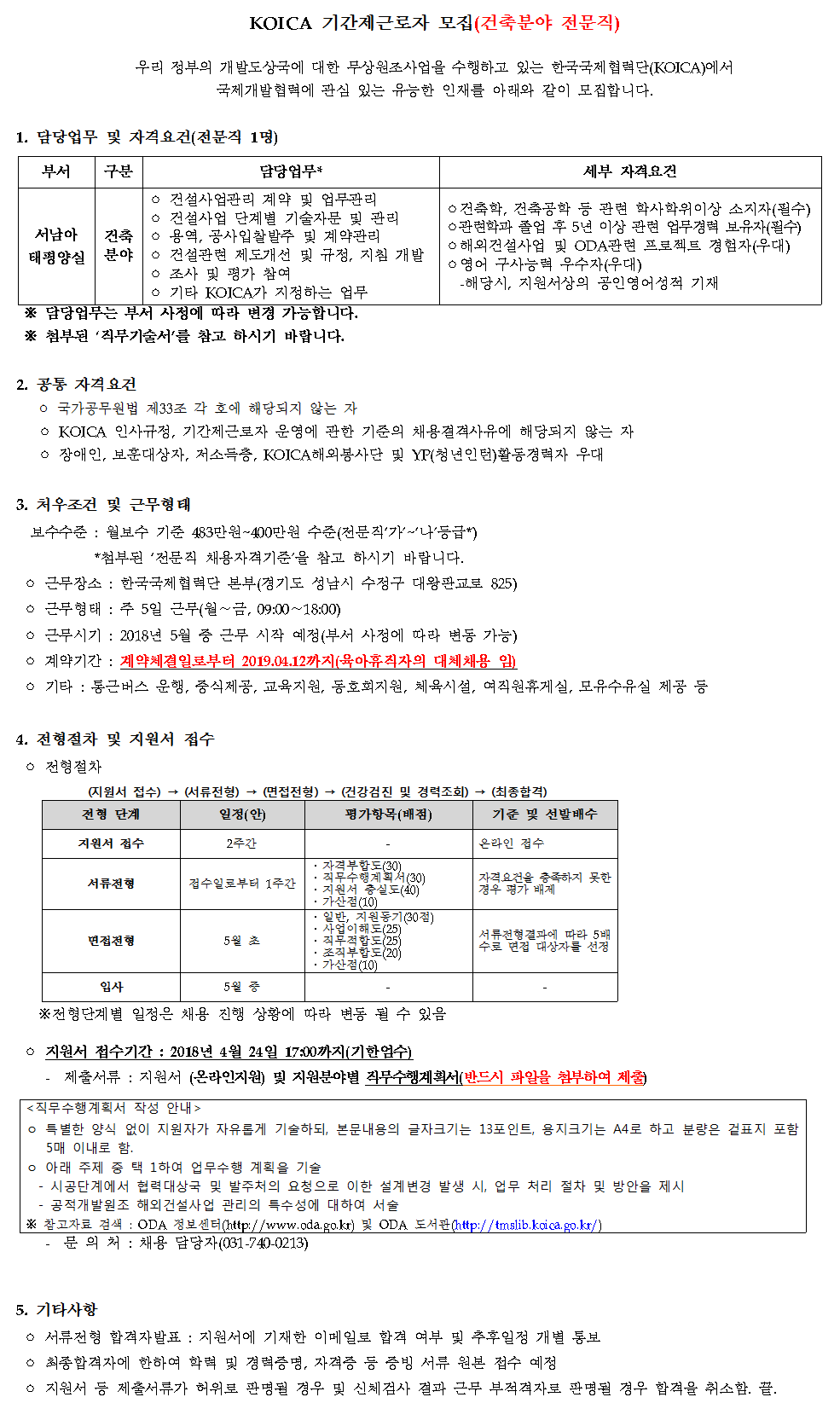 [Çѱ¹±¹Á¦Çù·Â´Ü] KOICA ±â°£Á¦±Ù·ÎÀÚ ¸ðÁý(°ÇÃàºÐ¾ß Àü¹®Á÷) (~4.24)