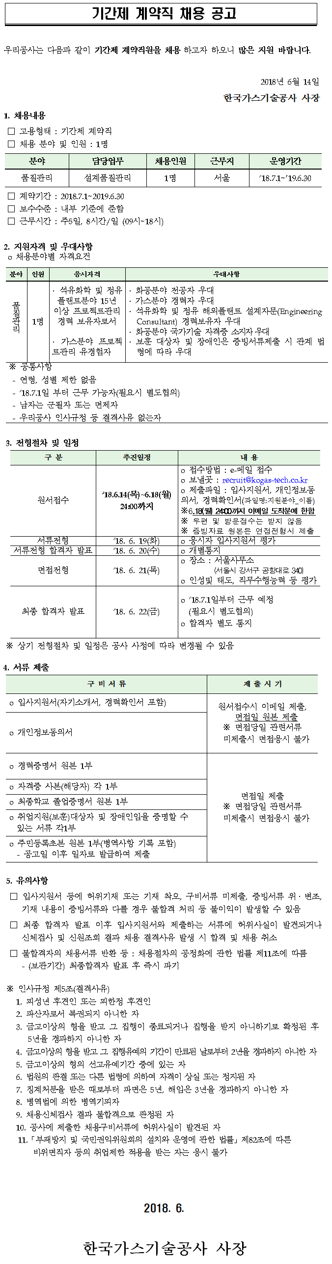 [Çѱ¹°¡½º±â¼ú°ø»ç]±â°£Á¦ °è¾àÁ÷(¼³°è ǰÁú°ü¸®) ä¿ë°ø°í(~6.18)