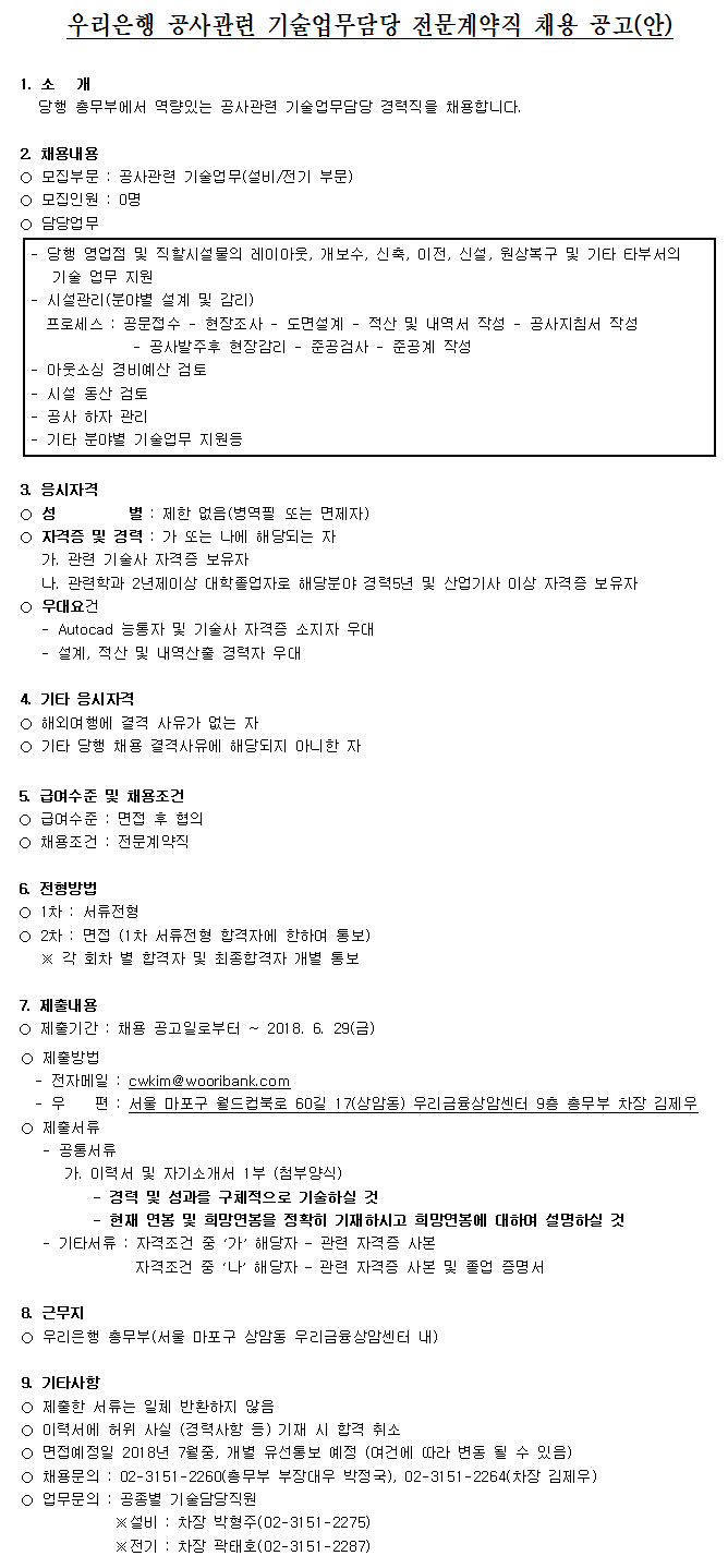 [¿ì¸®ÀºÇà]°ø»ç°ü·Ã ±â¼ú¾÷¹«´ã´ç Àü¹®°è¾àÁ÷ ä¿ë°ø°í(~6.29)