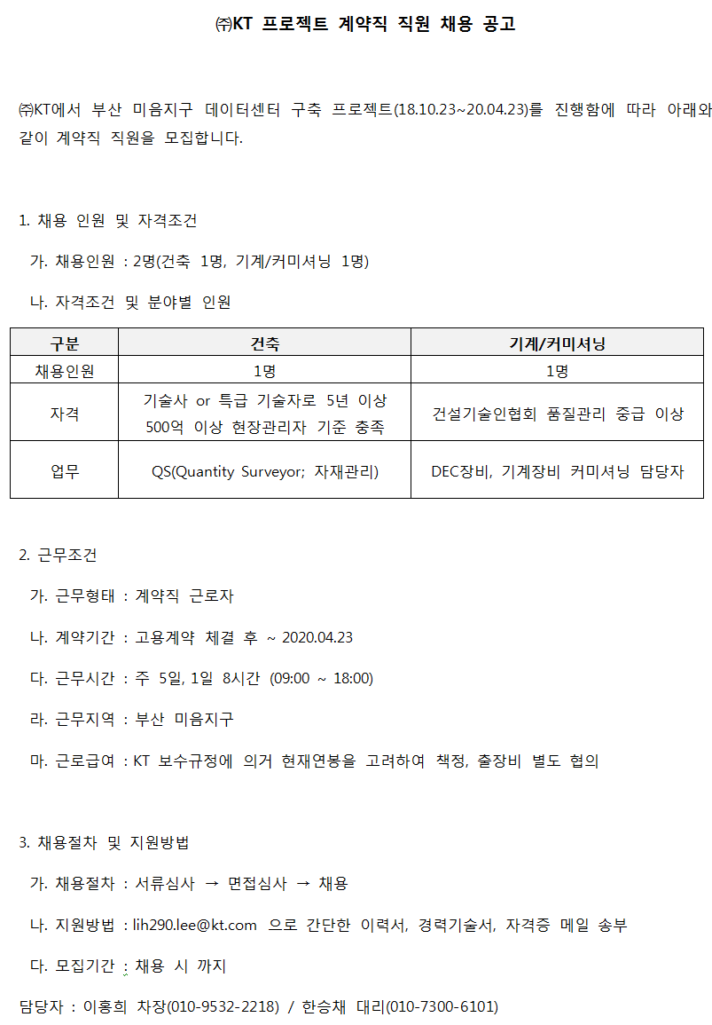 [ÄÉÀÌÆ¼] ¢ßKT ÇÁ·ÎÁ§Æ® °è¾àÁ÷ Á÷¿ø ä¿ë °ø°í(~ä¿ë½Ã±îÁö)