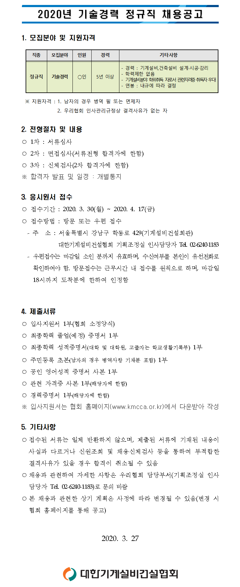 [´ëÇѱâ°è¼³ºñ°Ç¼³Çùȸ] 2020³â ±â¼ú°æ·Â Á¤±ÔÁ÷ ä¿ë°ø°í(~4.17)