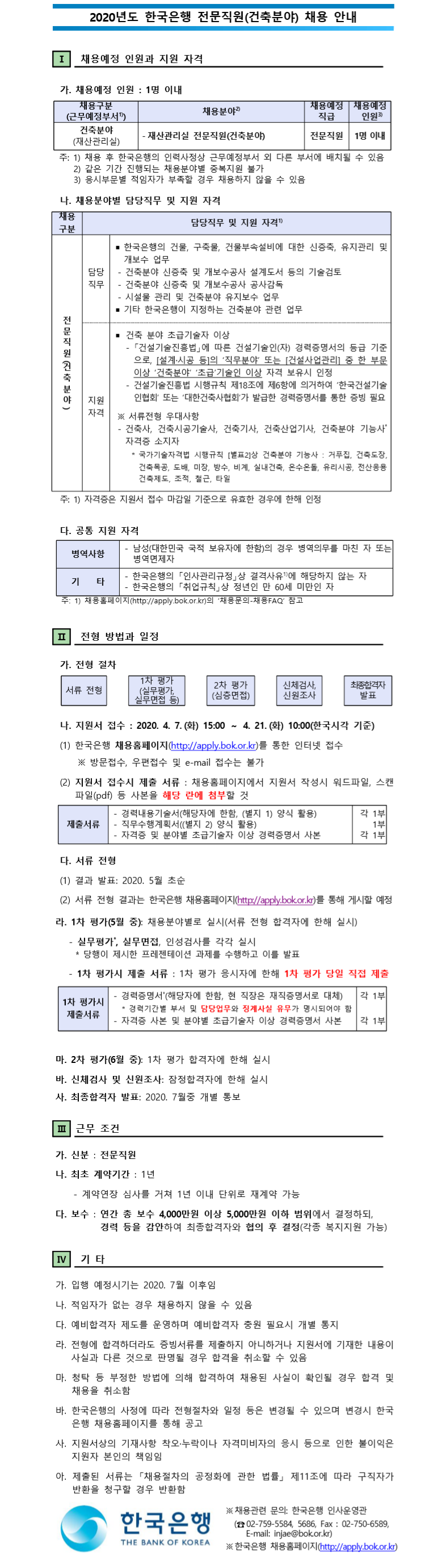 [Çѱ¹ÀºÇà] 2020³âµµ Çѱ¹ÀºÇà Àü¹®Á÷¿ø(°ÇÃàºÐ¾ß) ä¿ë ¾È³»(~4.21)