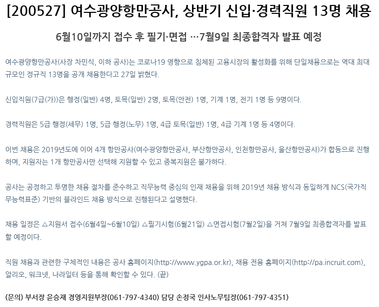 [¿©¼ö±¤¾çÇ׸¸°ø»ç] »ó¹Ý±â ½ÅÀÔ£¿°æ·ÂÁ÷¿ø 13¸í ä¿ë(~6.10)