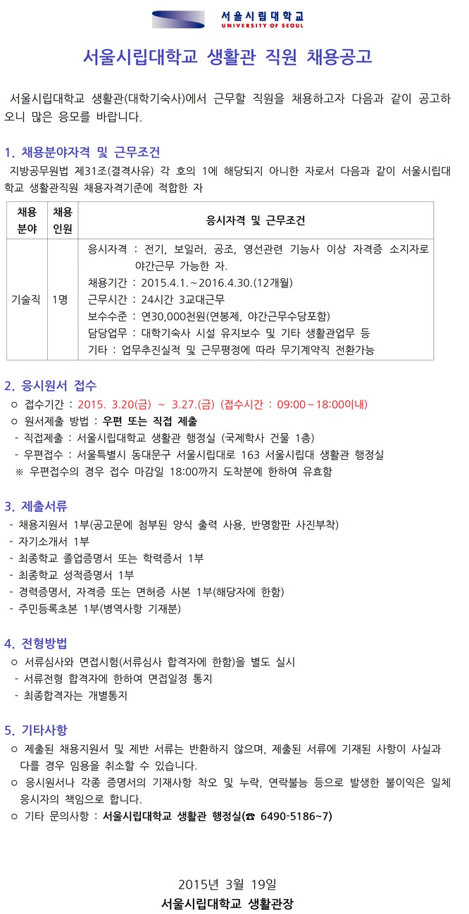 Á¦¸ñ [¼­¿ï½Ã¸³´ëÇб³] °è¾àÁ÷ ½ÅÀÔ»ç¿ø(±â¼ú) ä¿ë°ø°í ( ~3.27)