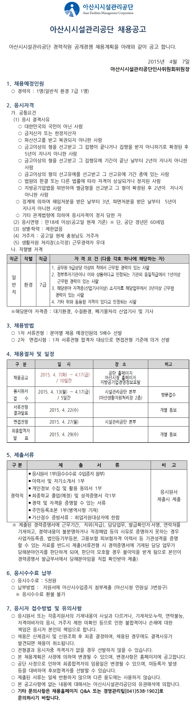 [¾Æ»ê½Ã½Ã¼³°ü¸®°ø´Ü] Á¤±ÔÁ÷ °æ·Â»ç¿ø(ȯ°æ) ä¿ë°ø°í ( ~4.17)