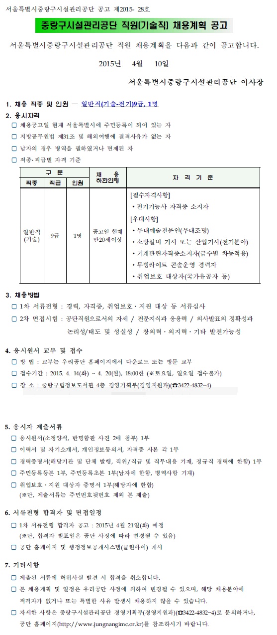 [¼¿ïÁß¶û±¸½Ã¼³°ü¸®°ø´Ü] Á¤±ÔÁ÷ ½ÅÀÔ»ç¿ø(Àü±â) ä¿ë°ø°í ( ~4.20)