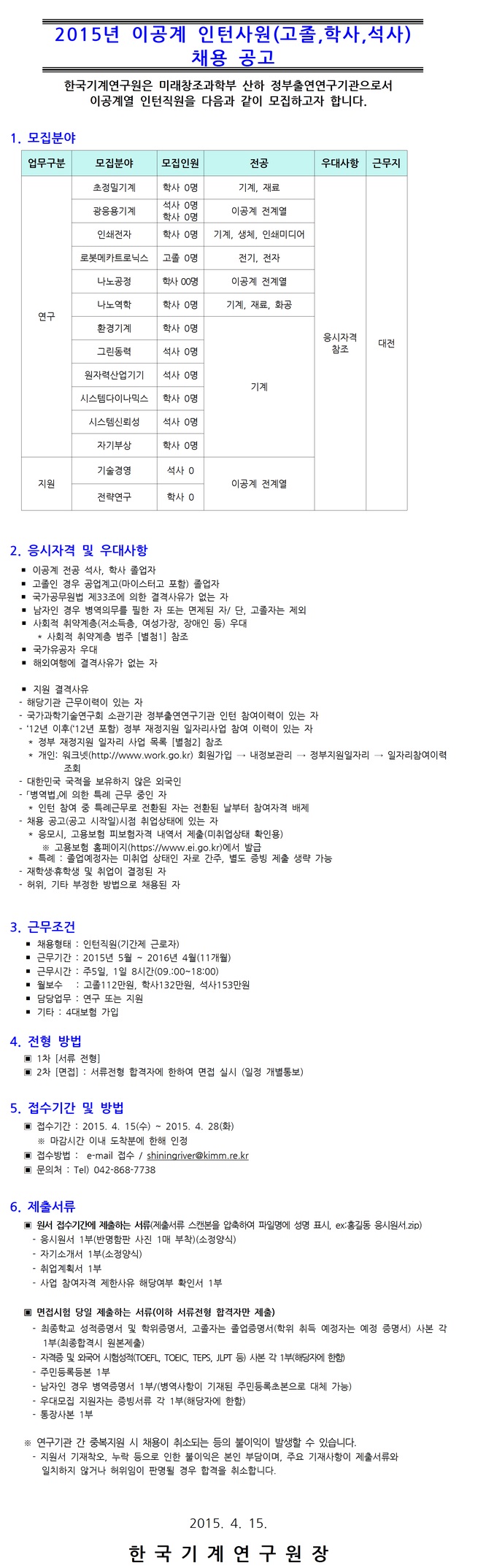 [Çѱ¹±â°è¿¬±¸¿ø] À̰ø°è ÀÎÅÏ»ç¿ø(°íÁ¹/´ëÁ¹/¼®»ç) ä¿ë°ø°í ( ~4.28)