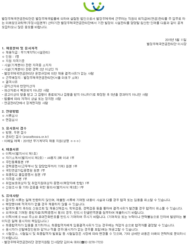 [º°Á¤¿ìü±¹¿¬±Ý°ü¸®´Ü] ¹«±â°è¾àÁ÷ »ç¿ø(½Ã¼³°ü¸®) ä¿ë°ø°í ( ~5.26)