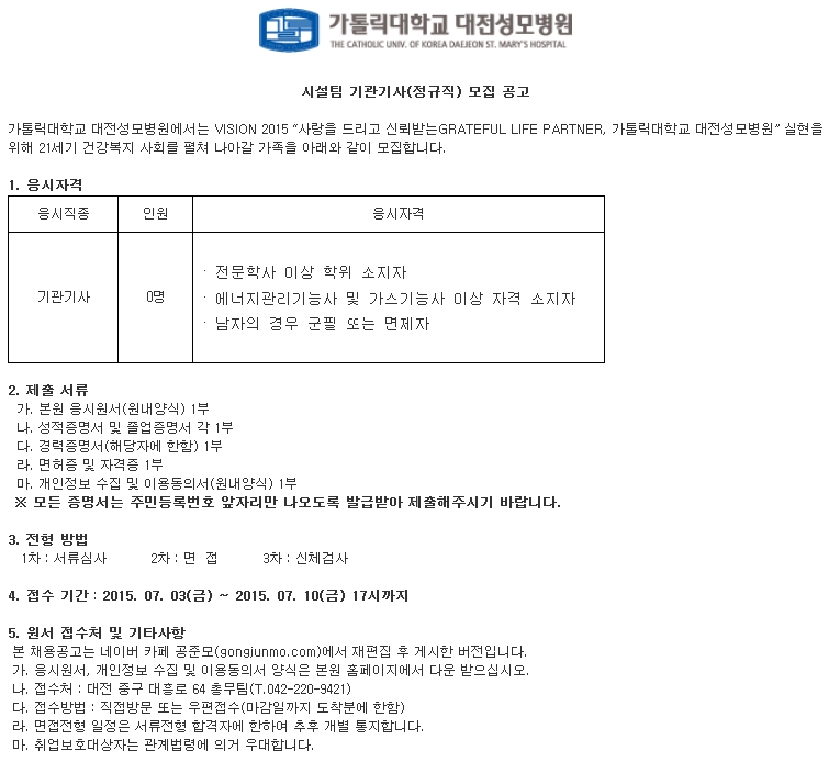 [°¡Å縯´ëÇб³ ´ëÀü¼º¸ðº´¿ø] Á¤±ÔÁ÷ ½ÅÀÔ ±³Á÷¿ø(½Ã¼³°ü¸®) ä¿ë°ø°í ( ~7.10)
