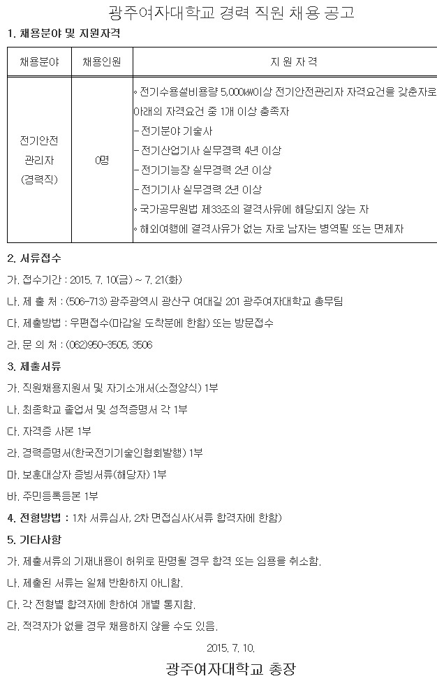 [±¤ÁÖ¿©ÀÚ´ëÇб³] Á¤±ÔÁ÷ °æ·Â ±³Á÷¿ø(Àü±â) ä¿ë°ø°í ( ~7.21)
