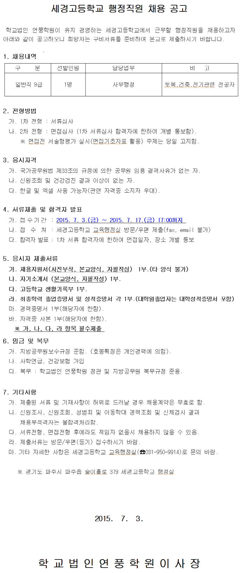 [¼¼°æ°íµîÇб³ ä¿ë] Á¤±ÔÁ÷ ½ÅÀÔ ±³Á÷¿ø(Åä¸ñ/°ÇÃà/Àü±â) ä¿ë °ø°í ( ~7.17)