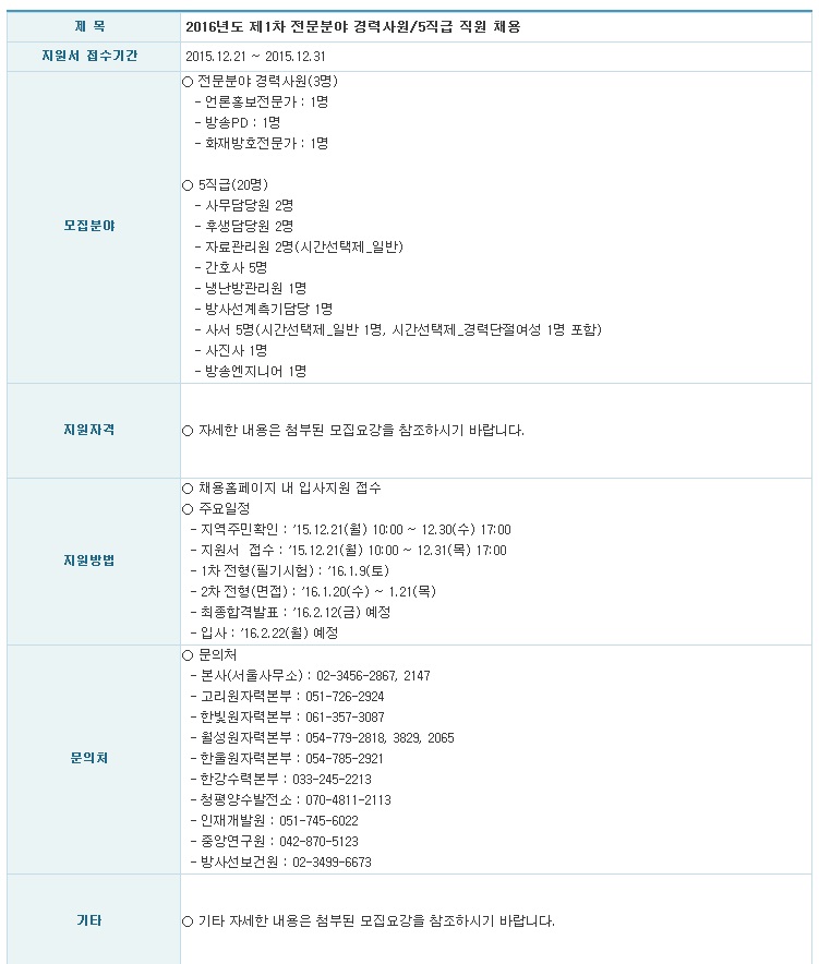 [Çѱ¹¼ö·Â¿øÀÚ·Â] 2016³â 1Â÷ 5Á÷±Þ ½ÅÀÔ/°æ·ÂÁ÷¿ø(¿©·¯ºÐ¾ß) ä¿ë°ø°í ( ~12.31)