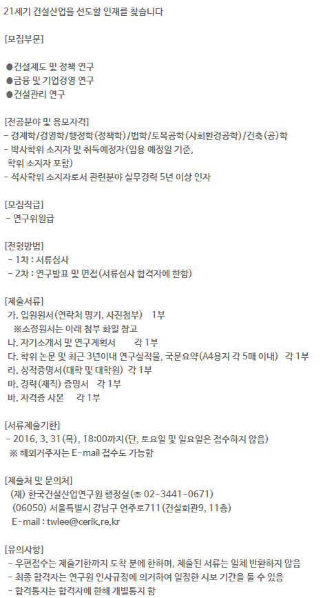 [°Ç¼³»ê¾÷¿¬±¸¿ø] 2016³âµµ ¿¬±¸Á÷¿ø(°ø°íÂüÁ¶) ¸ðÁý ( ~3.31)