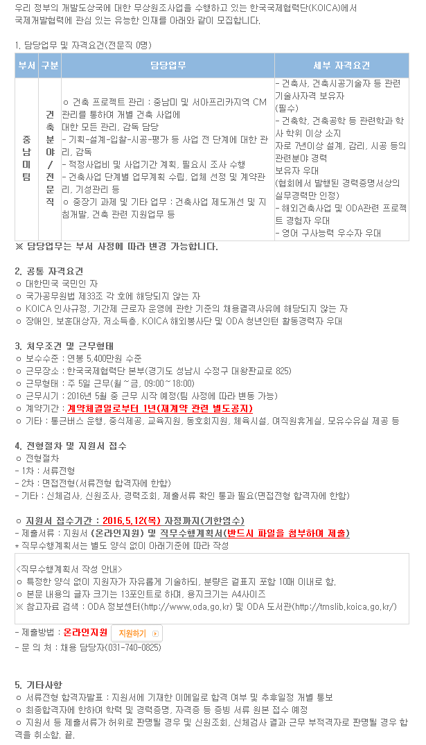 [Çѱ¹±¹Á¦Çù·Â´Ü] KOICA ±â°£Á¦±Ù·ÎÀÚ ¸ðÁý(Àü¹®Á÷/°ÇÃàºÐ¾ß)( ~5.12)