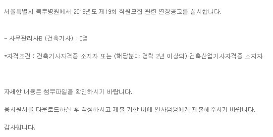 [¼¿ï½Ã ºÏºÎº´¿ø] 2016³âµµ Á¦19ȸ Á÷¿ø¸ðÁý ¿¬Àå°ø°í(»ç¹«°ü¸®»çB_°ÇÃà±â»ç)( ~6.27)